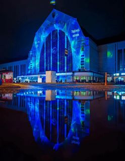 Істаляція «Поділись світлом» на фасаді київського вокзалу. Вона працюватиме з 21 до 25 грудня.